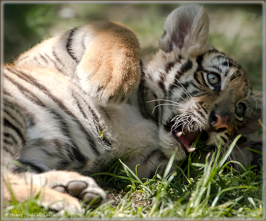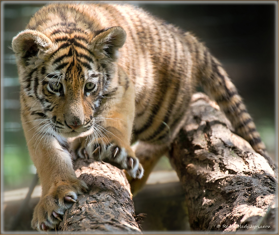 Vater Raul ist erst im Sommer 2012 nach Györ gekommen. Der siebenjährige „weiße Tiger“ eine selten vorkommende Farbvariante des Königtigers hat sich nach kurzer Eingewöhnungszeit gleich mit der hübschen Tigerdame Kama gut verstanden. Das Ergebnis waren zwei Tigerwelpen. Für die dreizehnjährige Kama war es der erste Wurf.