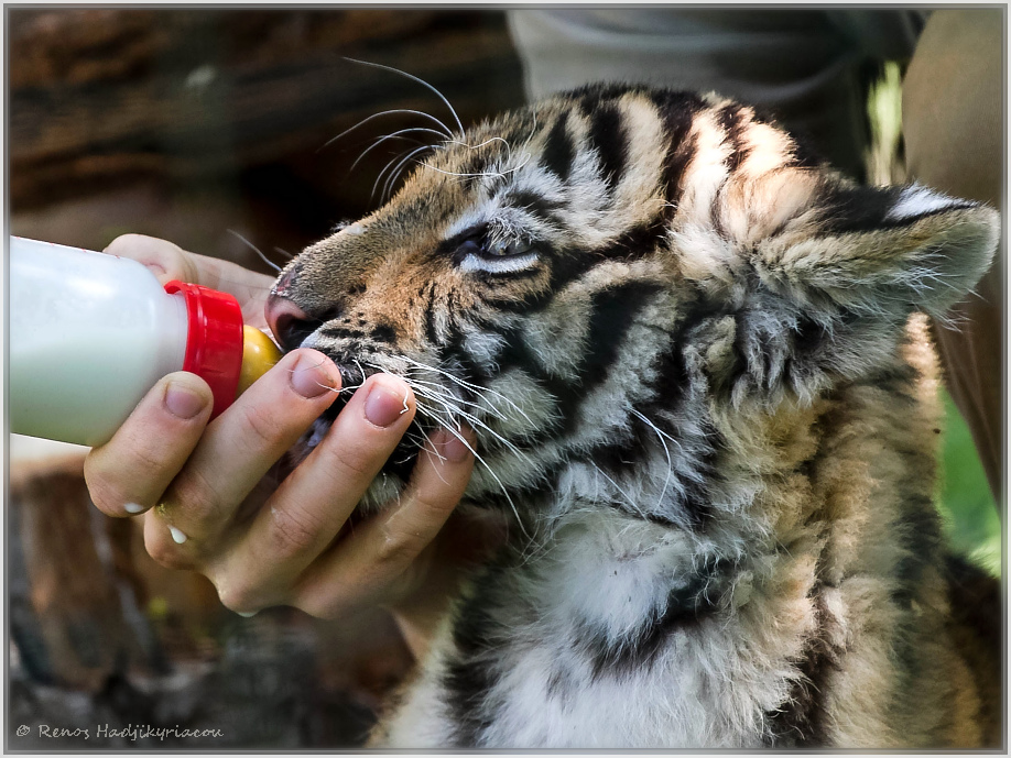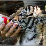 Durch die späte Trächtigkeit, Tigerweibchen sind mit ca. 4 Jahren geschlechtsreif und paaren sich alle 3-5 Jahre, hatte Kama kaum Milch und sehr wenig Interesse an ihren Jungen. Daher übernahmen die Pfleger die Aufzucht der Kleinen.